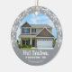 A perfect keepsake ornament to mark the first Christmas in a new home. The design offers a photo frame for a picture of your new home and custom text to personalize with your name and year. The background is grey and is accented with white snowflakes.