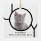 This Cat's First Christmas Photo Ornament is decorated with the word JOY in black and white.