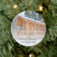 Commemorate your first Christmas in your new home with this beautiful modern keepsake ornament. The charcoal gray text reads "First Christmas in our new home," with the words "new home" in elegant handwriting script with flourishes before and after. Replace the sample image with a photo of your new house and add your family's last name. A white gradient filter helps make the text pop.
