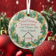 This beautiful custom new home Christmas ornament is personalized with your address and year in chic green and red typography within a festive holly berry wreath with gold garland wrapping around the greenery. Contemporary holiday present and housewarming gift. First Christmas in Our New Home.