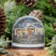 Commemorate your first Christmas in your new home with this beautiful modern keepsake snow globe. The white text reads "First Christmas in our new home," with the words "new home" in elegant handwriting script with flourishes before and after. Replace the sample image with a photo of your new house and add your family's last name in white sans serif font. A dark gradient filter helps make the text pop.
