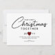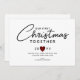 First Christmas Together Couples Rustic Heart Holiday Card has a minimalist design with a white background and black hand lettered script mixed with simple font lettering. The text is "our first Christmas together" and custom year. A small rustic buffalo plaid red and black heart is in the middle of the year. A simple customizable greeting is on the lower centre. Personalized with couple's signature names.