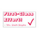 This inspirational rubber stamp design features the motivational feedback message "First-Class Effort!" and a customized educator name. It also features a decorative check mark. It could be used by a teacher, educator, instructor, or tutor when grading student work, to indicate that a student has done an exceptional job.