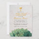 There is a gold chalice with eucharist above the text (it's faux gold foil). Under the text, there is a green succulent. The name is written in a golden elegant calligraphic script, the occasion in golden caps, the res tin black caps. The background and the back are white marble.