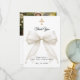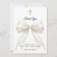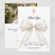 A modern and elegant First Communion thank you card. A white background, decorated with a large ivory colored bow with pearls and a golden cross. On the front the text: Thank You, name, and a date.