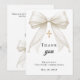 A modern and elegant First Communion thank you card. A white background, decorated with a large ivory colored bow with pearls and a golden cross. On the front the text: Thank You, name, and a date.