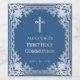 This elegant blue and silver religious design with a vintage air, recommended for a boy, has an ornate faux silver foil frame with elegant baroque decorations on a classic blue background. Above the text there is a religious cross in faux silver foil. The occasion is also in faux silver; the rest of the text has a silvery grey colour similar to the faux silver frame.