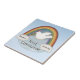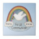 Ceramic tile to commemorate a First Holy Communion. Design features white dove with olive branch with rainbow and clouds. Personalize with name and date. Makes a beautiful keepsake for a First Holy Communion.
