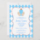 Modern first communion invitation features blue and brown harlequin, cross, and chalice.