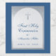 A simple but modern religious design. On a classic blue rectangular background, it has a faux silver foil arch that has inside blue text on white background. There is a faux silver foil above the text. The occasion and the name are written in an elegant calligraphic script.