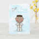 A First Holy Communion congratulations card for a boy. The design has a cute dark-skinned boy, kneeling in prayer and holding rosary beads on a blue and white background with a watercolor look. There is a white dove with branch at the top. Graphics ©Scrappin Doodles.