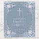 This elegant dusty blue and silver religious design with a vintage air, recommended for a boy, has an ornate faux silver foil frame with elegant baroque decorations on a dusty blue background. Above the text there is a religious cross in faux silver foil. The occasion is also in faux silver; the rest of the text has a golden colour similar to the faux gold frame.