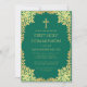 This emerald green and gold first communion invitation with a vintage air has an ornate faux gold foil frame with gold leaves on an emerald green background. Above the text there is a religious cross in faux gold foil. All text can be personalized and has a golden yellow colour similar to the faux gold frame.