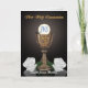 Image and illustration composition of gold chalice on Black, white roses and text for child's First Holy Communion party invitation