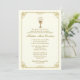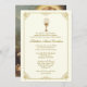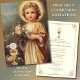 Featuring a beautiful custom designed First Holy Communion invitation with a beautiful image of the Child Jesus holding a bouquet of flowers. The Holy Eucharist is overlaid on the right side. On the back of the invitation is a gold chalice and host emphasizing the sacredness of this joyous occasion.