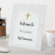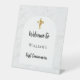 Marble print as background and a white arch shaped frame. A golden cross.  Personalize and add a name. Back: no design