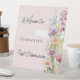 A light pink background, decorated with summer flowers, wildflowers in pink and purple with a large white cross. Personalize and add a name.