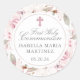 Beautiful blush pink roses frame this elegant First Holy Communion envelope seal. A soft mauve pink cross also decorates this sticker. First Holy Communion is written in a beautiful and traditional script font. your daughter's name is written in capital letters with the date below. You can also use it as a favour seal. This item is part of the Pink Rose and Peony collection. It contains templates to create your own invitation stationery, welcome signs, and party decorations. The let you spend more time enjoying your celebration and less time planning it!