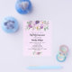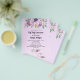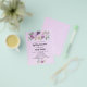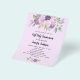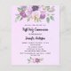 A violet, lavender watercolored background. Decorated with violet and purple watercolored flowers and greenery and a golden cross. Personalize and add your name and reception details.