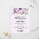 A violet, lavender watercolored background. Decorated with violet and purple watercolored flowers and greenery and a golden cross. Personalize and add your name and reception details.