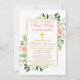 Modern Elegant Watercolor Pink Floral First Holy Communion Invitation includes pink roses, eucalyptus leaves and other beautiful botanical greenery foliage. Gold Cross.