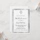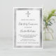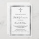 A modern, elegant and invitation. A white background decorated with a cross, faux silver frames. Personalize and add a name and details. Black text.