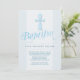 A blue and white baptism invitation with a decorative cross and the word "baptism" in calligraphy. (Pix). <br/><br/>The card is easy to customize with your wording, font, font colour and choice of six paper types.<br/><br/>Not exactly what you're looking for? All our products can be custom designed to meet your needs at no extra charge.<br/><br/>Simply contact us at askcottonlamb@gmail.com<br/><br/>Coordinating products available: