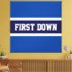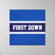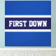 This sporty football design features athletic FIRST DOWN text inside a wide navy blue centre stripe outlined in white against royal blue outer stripes.