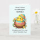 Celebrate your great-great-granddaughter’s first Easter with a personalized touch that makes this card even more special! Featuring an adorable chick breaking free from its shell, surrounded by vibrant spring flowers, this design symbolizes fresh beginnings and the beauty of new life. The soft pastel teal background enhances the joyful, whimsical feel, making it perfect for her first Easter. Personalizing the front with her name adds a unique keepsake quality, making this card even more meaningful. Inside, warm wishes extend your love and joy, creating a lasting memory of this milestone occasion!