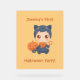 Adorable baby dressed in a black cat costume with a big orange bow is holding a lollipop with a skull image on it. A curved pumpkin stands just a little behind. Baby’s first Halloween party invitation, any gender.