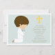 Blue First Holy Communion invitation featuring a kneeling brunette boy on the left, yellow cross with Communion or party details on the right in brown.