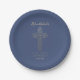 This modern first holy communion paper plate design features an intricate "gold foil" (simulated) style cross and the words "First Holy Communion" in a modern font. The background is navy blue, but can be customized to any colour of your choice. Add your child's name and religious event date to further customize this party tableware. Matching invitations, party favour boxes, and other coordinating event items are also available.
