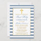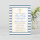 Elegant First Holy Communion Invitation with Cross. Dusty Blue and White Stripes. Gold Cross.