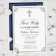 First Holy Communion invitation cards featuring a Cross and beautiful woven frame in shades of silver colour. The card's typography features a fusion of elegant caligraphy and modern minimalist text in shades of silver grey and navy blue. The front of the card is white while the back is navy blue with Cross and frame. Available in high quality print or downloadable, offering instant digital download format for text messaging, email or social media posts.