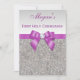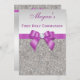 Elegant custom silver First Holy Communion invitations for girls with a beautiful glittery silver printed image sequins jewels, gems pattern, cute, sophisticated shiny radiant orchid / purple / lilac / lavender / mauve printed bows and ribbons images and pretty digital image diamonds bling jewels and purple text on a silver gradient background. Please note: All invites on Zazzle have flat printed images. These classy, fancy, glamourous, girly 1st Communion invites are decorated both sides. Beautiful, stylish, chic, trendy, modern, glitz and glamour invitations. Text, font and colour of font can all be customized. If you need assistance customizing your product please contact me through my store. I will be happy to help.