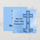 Cute and unique design with blue colours, shown says: "Daniel's First Holy Communion" on the front with an original art design of a special cross with star burst all reflected in the peaceful water ripples below. Easily change the name and add your custom text on the back. Remember this special holy day with these custom invites and announcements for your family and friends. See similar First Communion stickers and buttons, pins, magnets, t-shirts, postage stamps, and binders at MVDesigns store. Also great for confirmations, baptisms, and weddings!