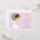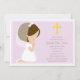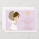 Lavender First Holy Communion invitation featuring a kneeling brunette girl on the left, yellow cross with Communion or party details on the right in brown.