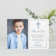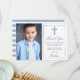 Elegant Light Blue and Silver First Holy Communion Thank You Card with Cross. Photo Front. Striped Back.