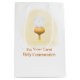First Holy Communion design features an image of a chalice with the Eucharist as centre design. Customizable text is displayed below in gold lettering just below image.