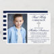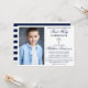 Modern Elegant Navy Blue First Holy Communion Invitation with Silver Cross and Photo. Blue and White Striped Back.
