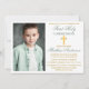 Modern Elegant Sage Green and Gold First Holy Communion Invitation with Cross and Photo.