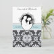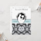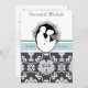 Our First Kiss 5x7" customized wedding invitation features a newlywed husband and wife about to engage in their first kiss. A grey and white damask background with a sea blue band and text that reads "he asked...I said yes" and areas you can add your wedding ceremonye and reception details on a fully customizable classy and unique wedding invitation.