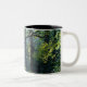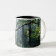 Brilliant white rays of the morning sun streaming from behind dark branches into a rich green summer forest, with massive ivy-covered trees and fertile underbrush.