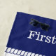 Personalize this nautical first mate's beach towel with your name. Design features a drawing of a navy blue anchor and navy blue and white rope border. The word "First Mate" is above and below is a name for you to personalize.