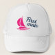 First mate pink ladies nautical sailing boat Trucker Hat. Cute gift idea for girlfriend, wife, sailor, skipper, fisher, boat captain, yacht owner, husband, father, dad, wife, girlfriend etc. Pink sailboat design with humourous quote. Cool summer cap for women. Great for boating and sailing trips. Also fun as retirement gift. Ship silhouette in any colour.