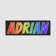 This fun, vibrant, multicolored name tag design features the common first name "ADRIAN", with the letters of the name having a colourful rainbow spectrum like gradient colouring pattern, on a black coloured background. A nametag like this might be worn by a customer service representative, an employee, or a volunteer whose given name is Adrian, to help identify the wearer to customers or other people. [~Z0000344]