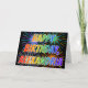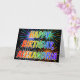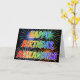 This vibrant, multicolored and fun birthday greeting card design features the message "HAPPY BIRTHDAY," and the common first name "ALEXANDRIA" with the letters having a colourful rainbow spectrum like gradient colouring pattern. The background of the front also features a colourful bursting fireworks inspired pattern. The inside features a customizable greeting message, or could perhaps be cleared and left blank if a message is to be written by hand instead. A birthday greeting card like this could be a fun way to send a customizable birthday greeting message to somebody named Alexandria. [~Z0000350]