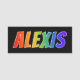 This fun, vibrant, multicolored name tag design features the common first name "ALEXIS", with the letters of the name having a colourful rainbow spectrum like gradient colouring pattern, on a black coloured background. A nametag like this might be worn by an employee, a volunteer, or a staff member whose given name is Alexis, to help identify the wearer to customers or other people. [~Z0000344]