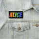 This fun, vibrant, multicolored name tag design features the common first name "ALICE", with the letters of the name having a colourful rainbow spectrum like gradient colouring pattern, on a black coloured background. A nametag like this might be worn by a customer service representative, a volunteer, or an employee whose given name is Alice, to help identify the wearer to others. [~Z0000344]