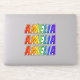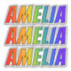 This vibrant, fun, and exciting sticker design features the common first name or given name "AMELIA", with the letters of the name featuring a colourful rainbow spectrum inspired gradient colouring pattern. It might be a fun present to give to somebody named Amelia. [~Z0000361]